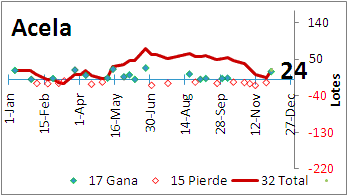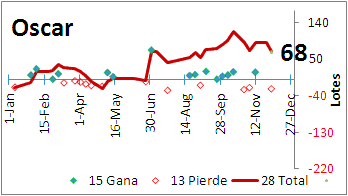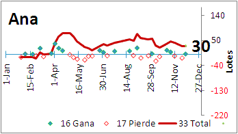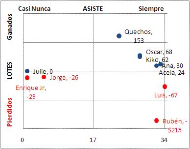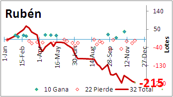 | Resumen individual - La Sr. Acela con un buen anio - Ana no hizo de las suyas ganando - Luis nunca siempre estuvo en negativos - Oscar con unas buenas noches mejoro - El Quechos siempre en positivos - Kiko al final despego para sacar ganancia - Ruben "el cliente", desde que inicio su perdida se mantuvo perdiendo |