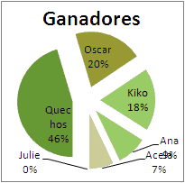 | 1ro. Quechos paricipa menos que la mayoria y resulta ganador 2dos Oscar y Kiko casi iguales en resultados 3ros. Ana y Sra. Acela con una diferencia muy baja 4to. Luis solo con una perdida considerable 5to. Ruben solo en el sotano - Ruben se da el lujo de perder el 68% - El Quechos de ganar el 46% - Los demas se reparten las perdidas y ganancias |