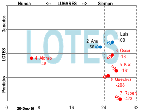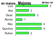 Nuevos records - Luis, brazalete de CAMPEÓN, temporada XXXI año 2016 - Llega a 5 títulos (1999, 2000, 2004, 2013, 2016) - Ruben y Quechos, 1ro y 5to perdedor en un año - Luis y Alonso, 1er y 5to mejor mano (25-nov-16, 11-nov-16) - Oscar y Luis, 1er y 5to mejor noche (7-oct-16, 25-nov-16) - Ruben, 3ro peor noche (7-oct-16) - 1er y 6to, más lotes jugados (25-nov-16, 11-nov-16) - 1er y 2do, mayor consumo Inicia el SAT con ISR (ganancias) y 2 multas (faltas y retardos) |